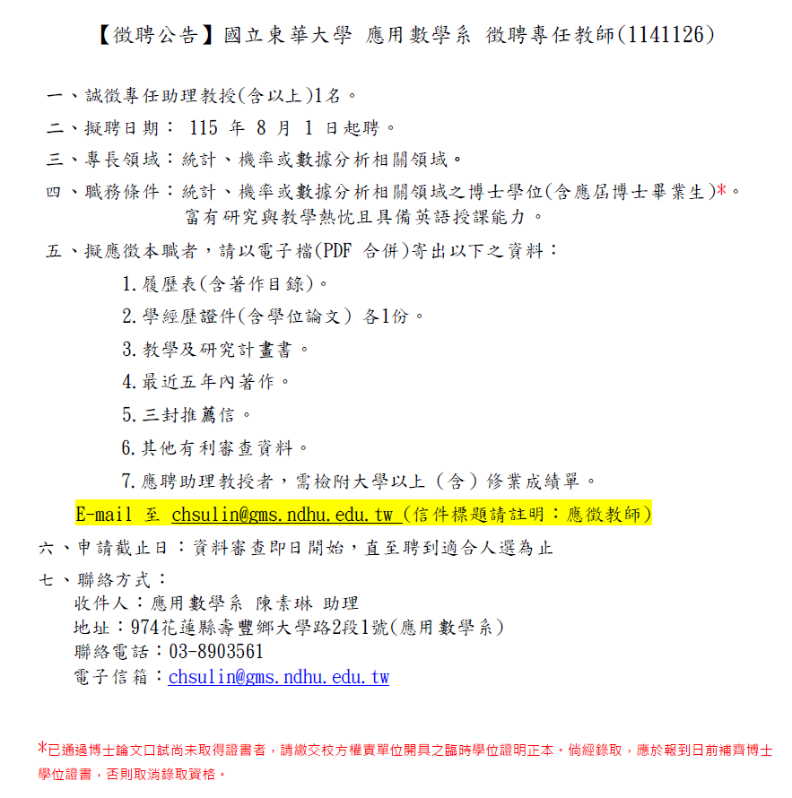 【徴聘公告】國立東華大學 應用數學系 徴聘專任教師(1141126)