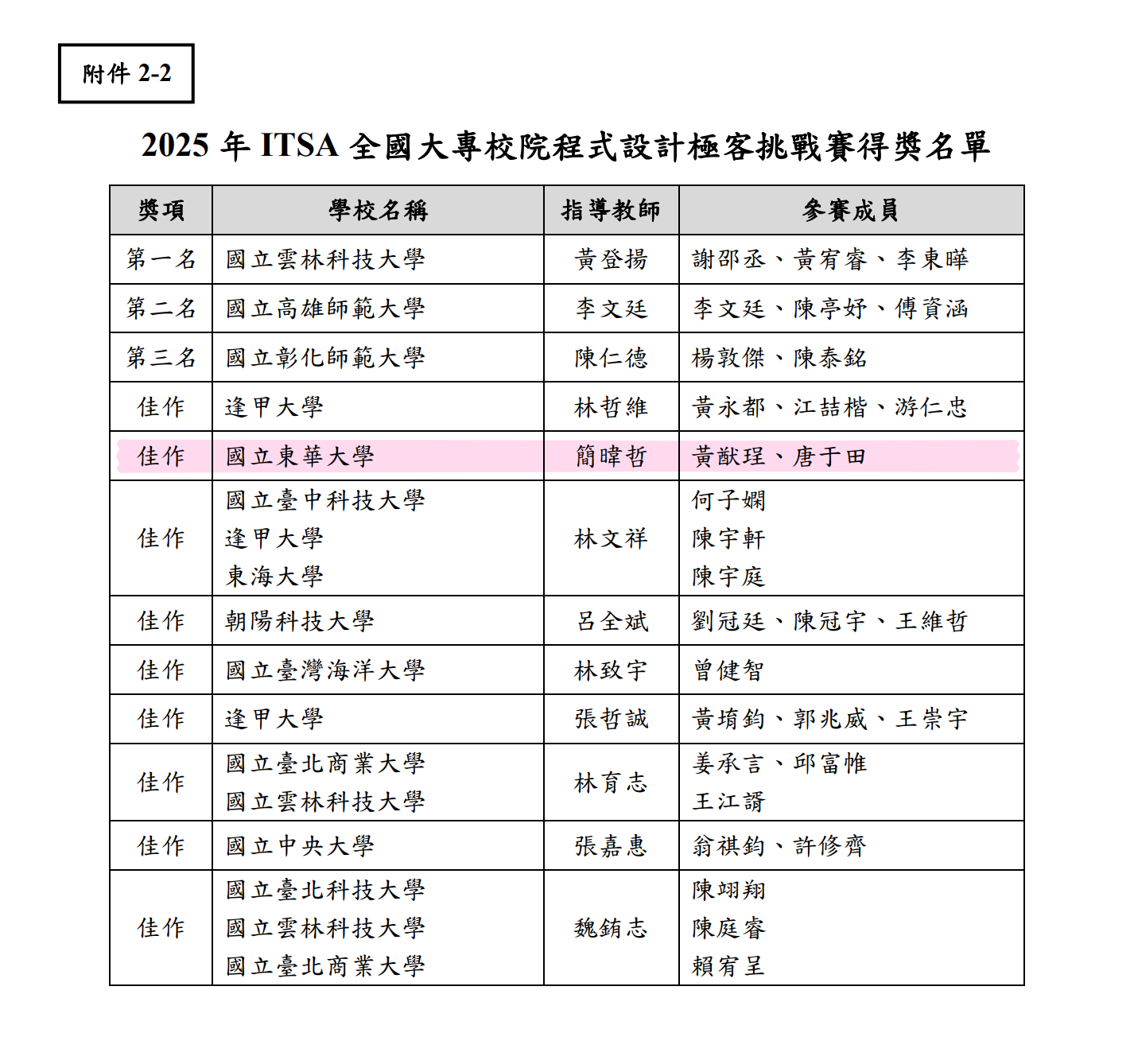 圖二:2025 年 ITSA 全國大專校院程式設計極客挑戰賽得獎名單