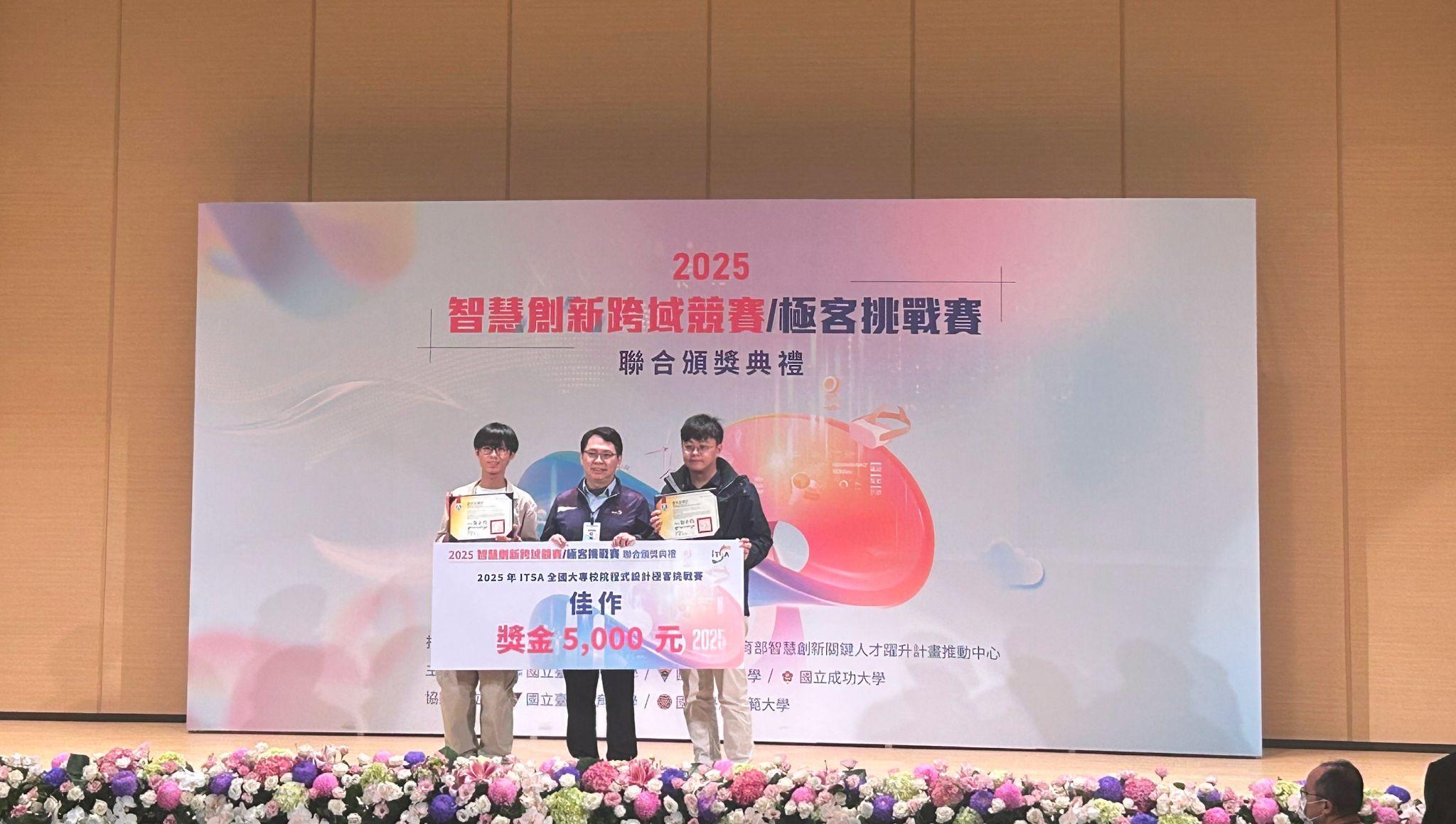 教育部主辦之「2025年 ITSA 全國大專校院程式設計極客挑戰賽」於 12 月 12 日舉行聯合頒獎典禮。本系四年級黃猷珵與資訊工程學系隊友唐于田組隊參賽,在資訊工程學系簡暐哲教授的指導下,參與「網頁程式設計與資料庫整合」專案的競逐,最終榮獲「佳作」肯定。